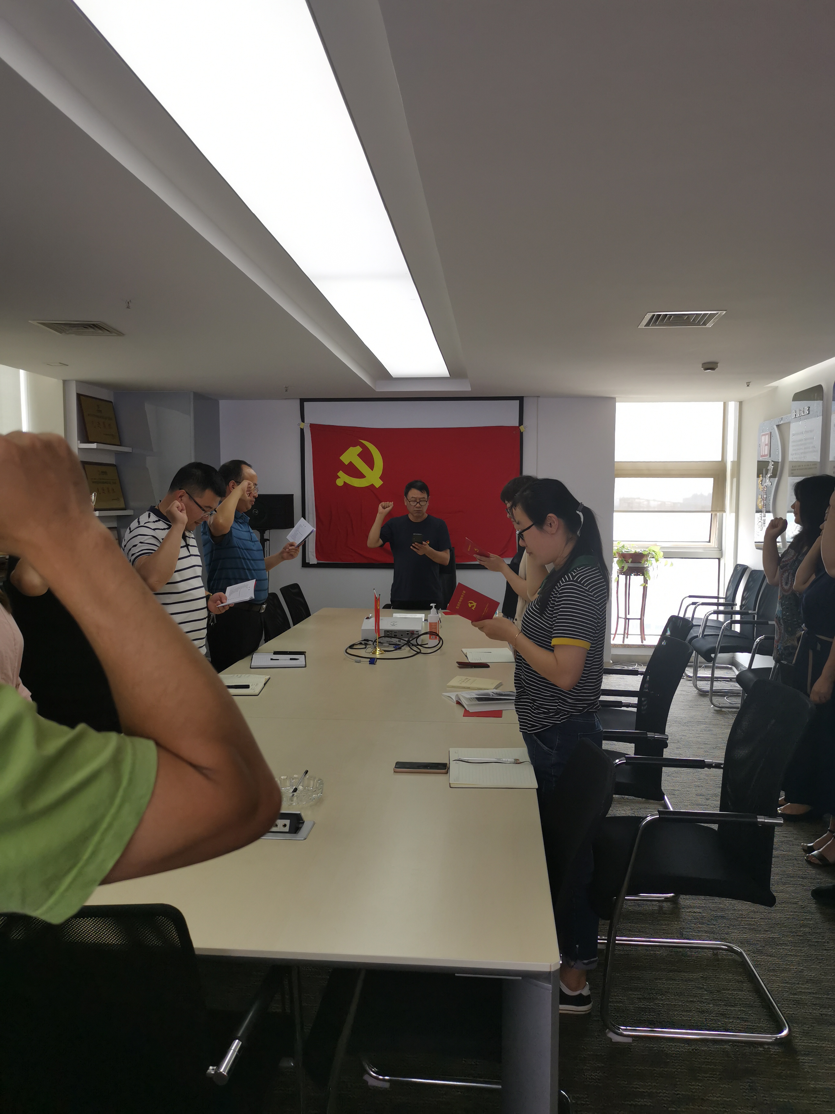 在我所姚煥剛總經(jīng)理的引領(lǐng)下,我所全體黨員莊嚴(yán)的舉起右手,在鮮紅的黨旗下重溫入黨誓詞,堅(jiān)定永遠(yuǎn)跟黨走的決心。